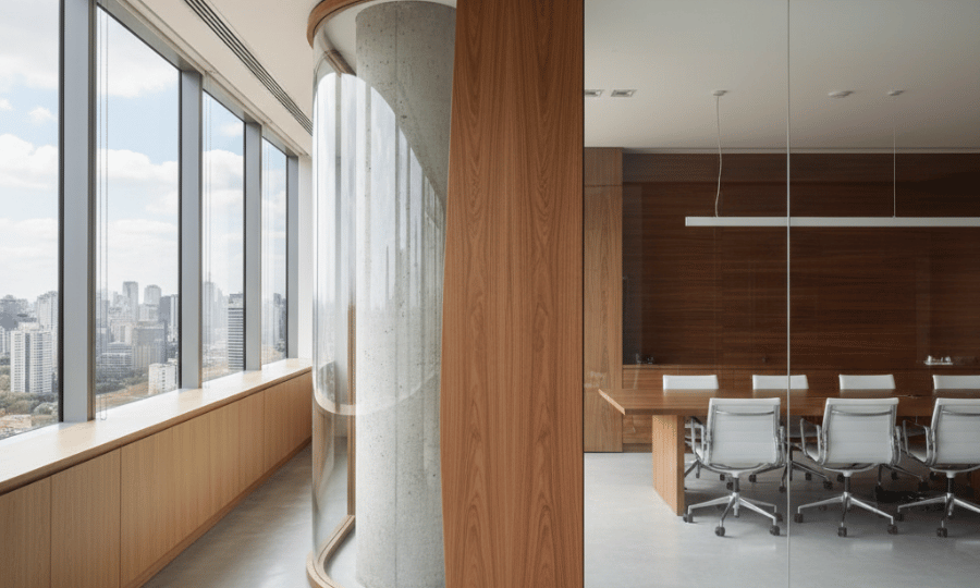A Versatilidade do MDF e do Vidro: Design Híbrido para Ambientes Corporativos Aconchegantes e Funcionais