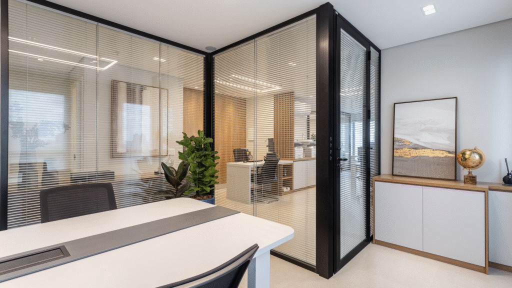 Divisórias Piso Teto de Vidro com persianas automatizadas: elevam o nível de sofisticação e praticidade, permitindo o controle da luminosidade e privacidade com um simples toque, ideal para ambientes de alto padrão.